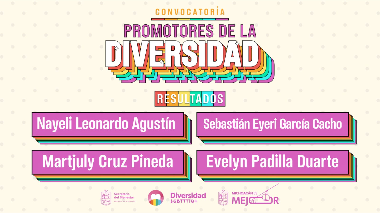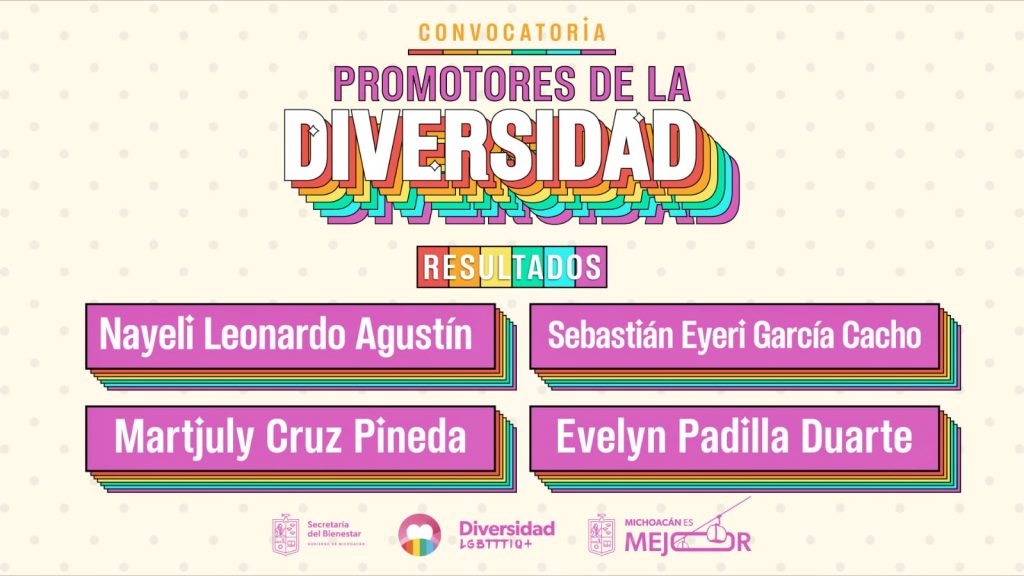Morelia, Michoacán, 27 de febrero de 2026.- La Secretaría del Bienestar (Sedebi) publicó la lista de las personas seleccionadas en la convocatoria Promotores de la Diversidad 2026, quienes impulsarán acciones de inclusión y respeto para todas las personas en distintos municipios del estado, informó su titular, Andrea Serna Hernández.